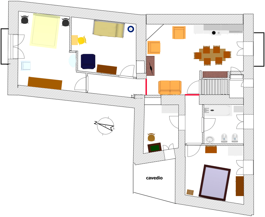 ATTENZIONE: per accedere dal living alle altre camere c’è un basso gradino (in piantina sono evidenziati con linee rosse).